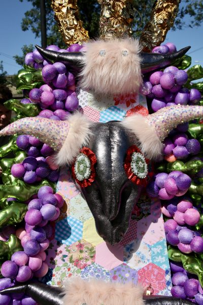 The cart itself is essentially a soft sculpture – hundreds of individually sewn and stuffed flowers and leaves as well as a skull and horns, topped with a crown made from 2 interlinked pool noodles!